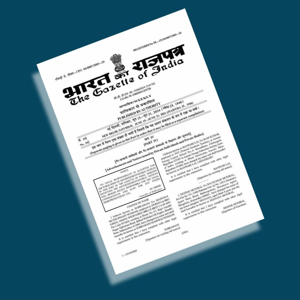 The only legal proof of a name change is Gazette Notification, which is valid for lifetime and is used in all documents for name changes. You can initiate the Gazette Notification process from the comfort of your home using our online name change service.